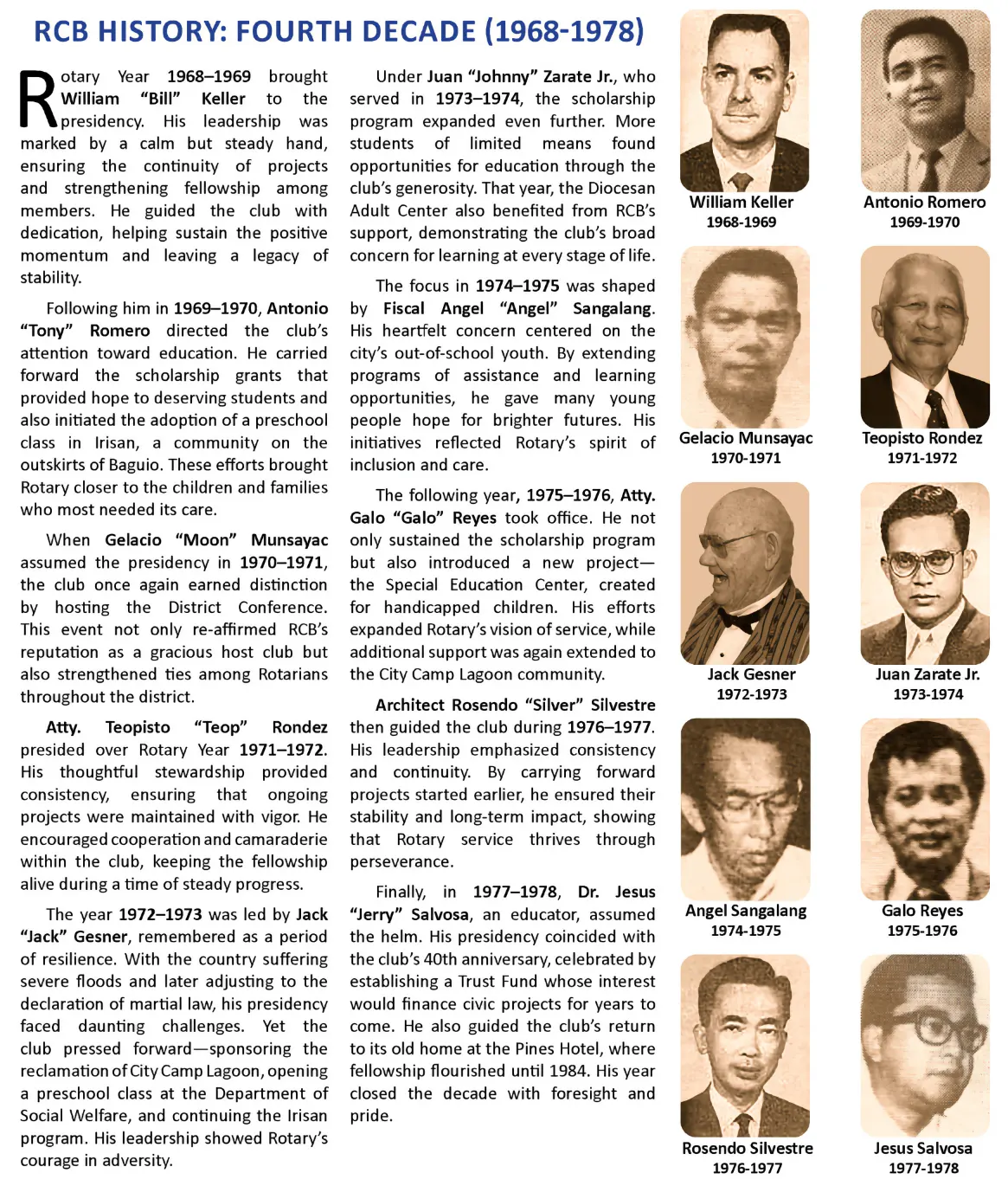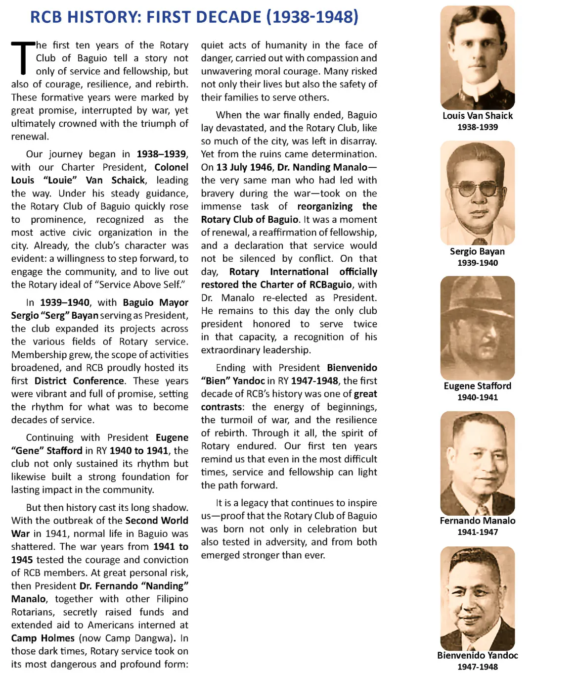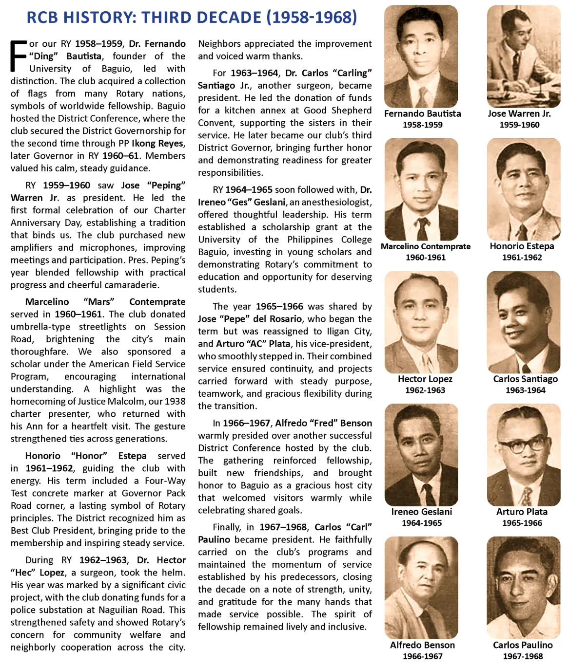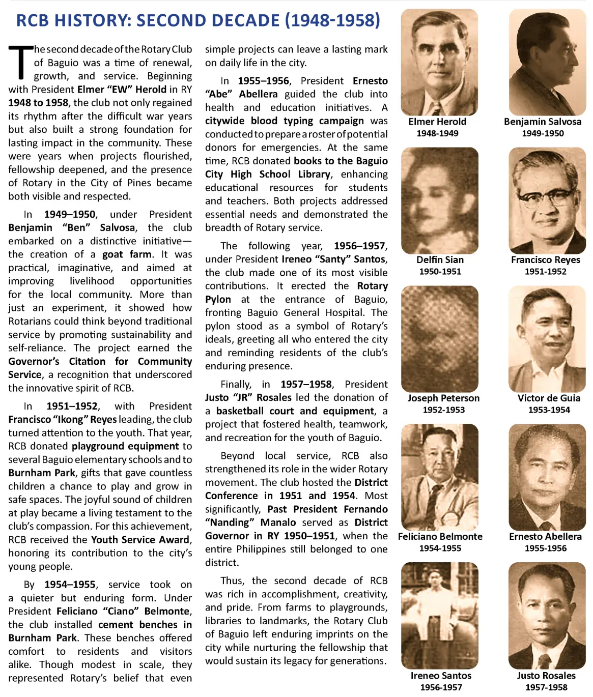 To emphasize our rich and illustrious past, our RCB History is being presented in the following by ten-year groupings, beginning with our Genesis. It is hoped that this system will make our website visitors more appreciative of our decade-by-decade transitions.